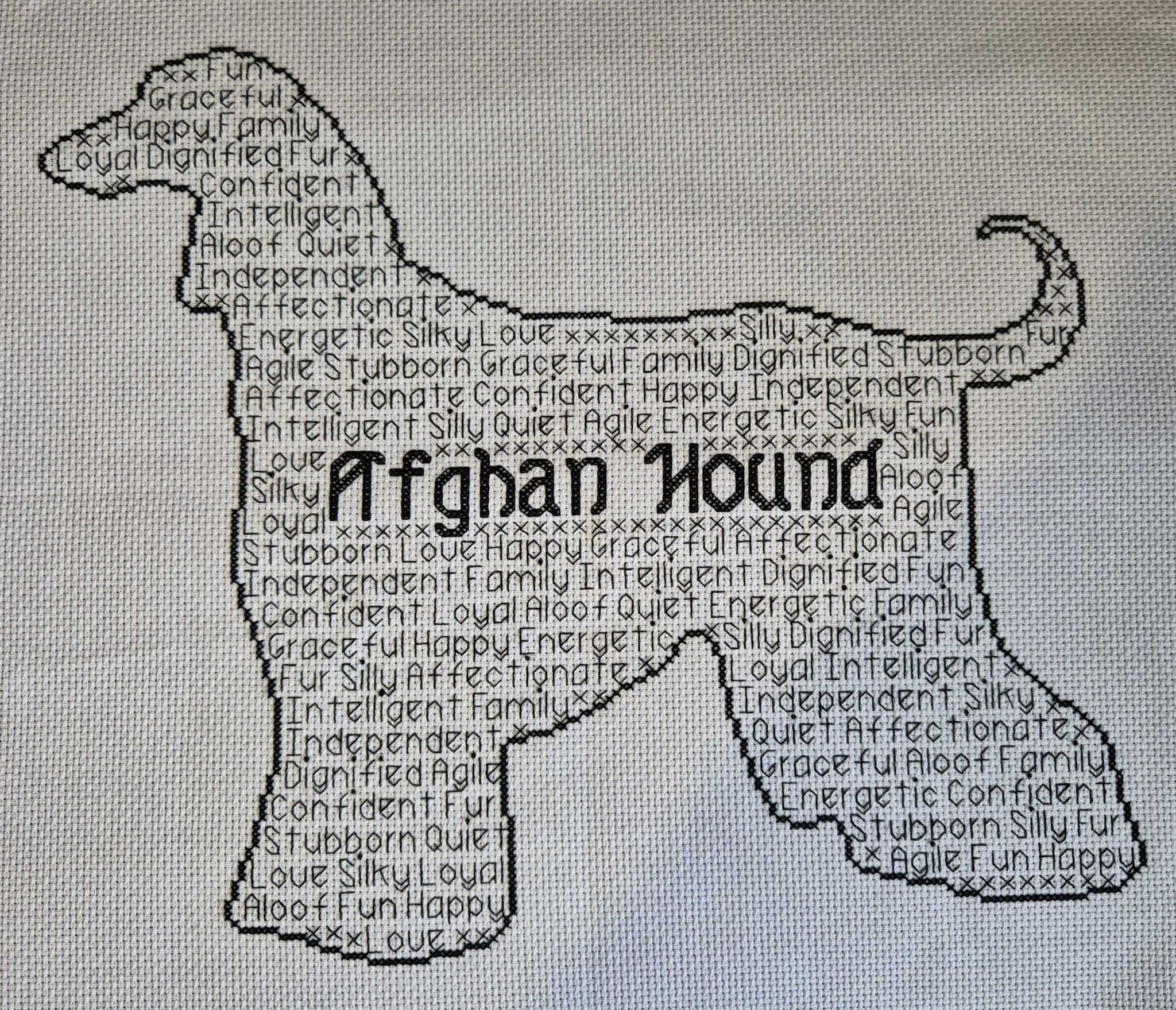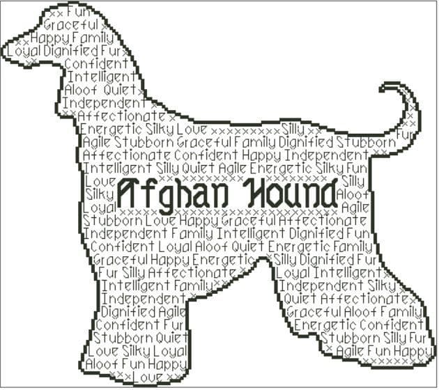 Afghan Hound In Words is a unique cross stitch chart measuring 167 stitches wide by 148 stitches high, and has been designed so you can use whatever colours you choose when stitching. It is perfect for hand dyed threads and fabric.